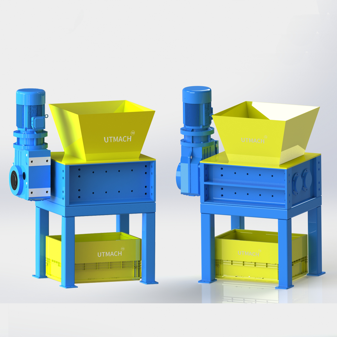 The Compact Single-Motor Dual Shaft Shredder is designed for users with limited workspace and moderate shredding needs. It features a vertical motor design, significantly reducing the installation footprint. Equipped with high-strength alloy blades customizable to different materials or requirements. An optional collection bin with swivel casters allows easy collection and mobility.
